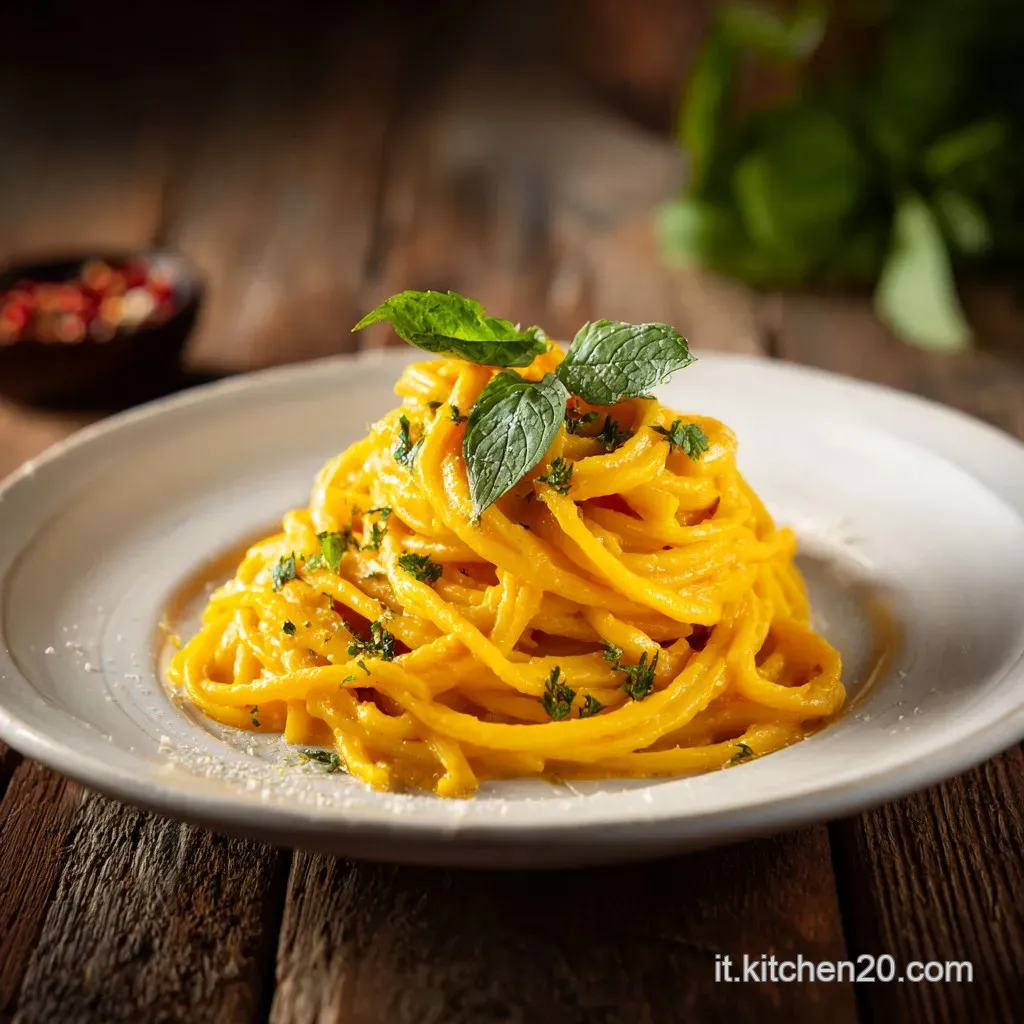 Presentare questo piatto è pura gioia visiva. Il giallo vibrante risalta magnificamente su piatti bianchi o blu scuro. Usa un forchettone e un mestolo per creare un nido di pasta al centro del piatto, lasciando che la crema coli leggermente verso i bordi.