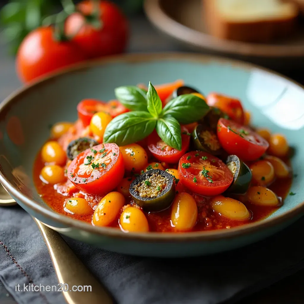 - Assemblaggio Finale: Unite le verdure rosolate alla salsa. Mescolate delicatamente. Un ultimo stufato lento per 10-15 minuti . Il vostro Stufato di verdure mediterraneo è quasi pronto.